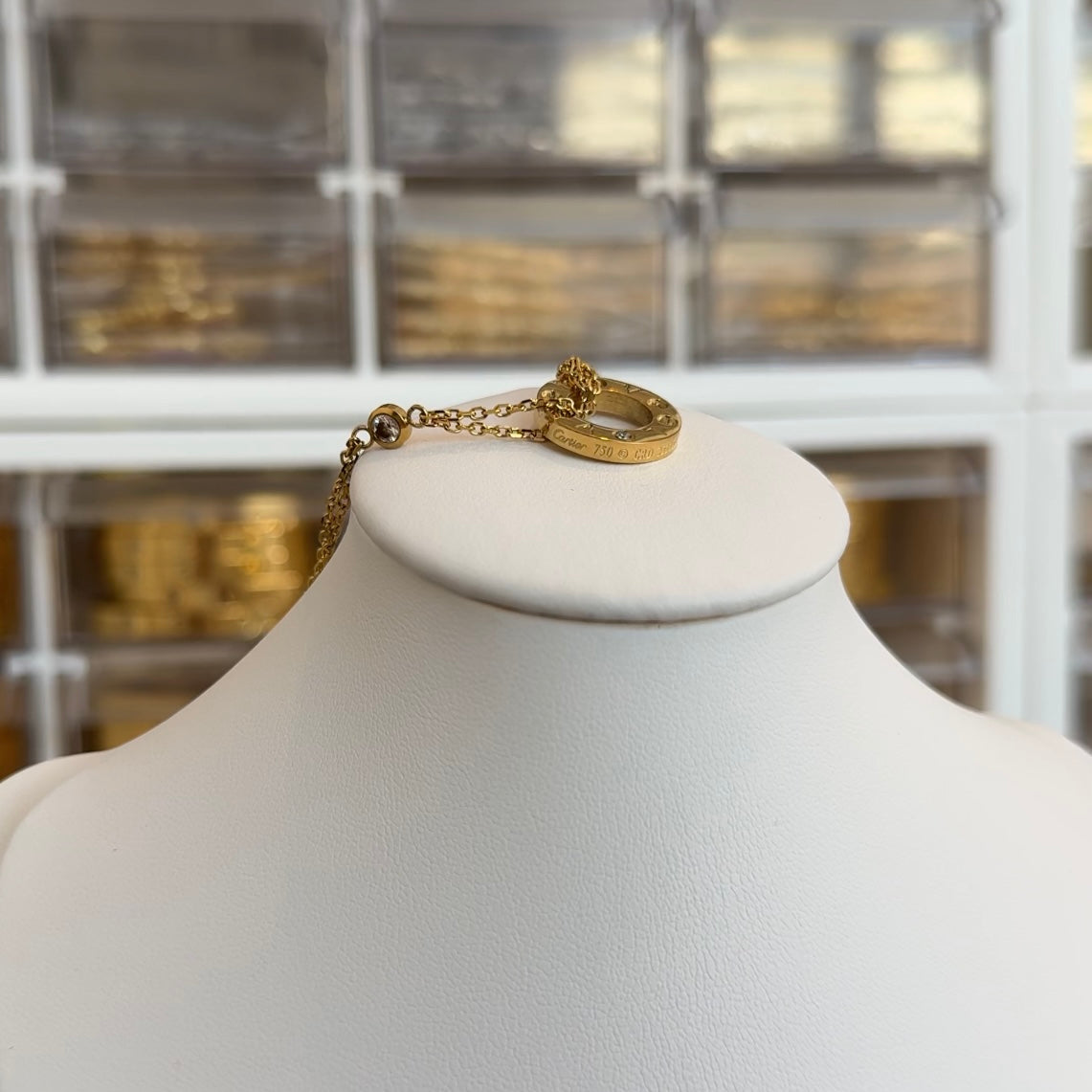 Stainless steel plated in gold. The necklace is double sided and stamped.
